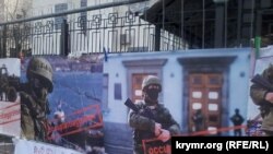 Kiyevde, fevral 23 künü, Rusiye elçihanesi yanında Qırımdan köçip kelgenler Qırım işğaline ve Rusiyeniñ insan aqları boyunca siyasetine qarşı narazılıq numayışını keçirdiler.