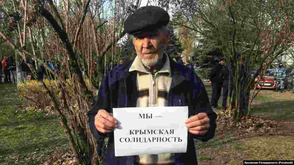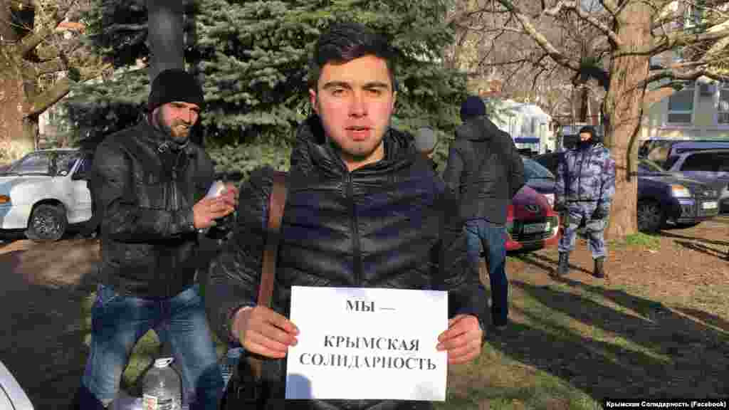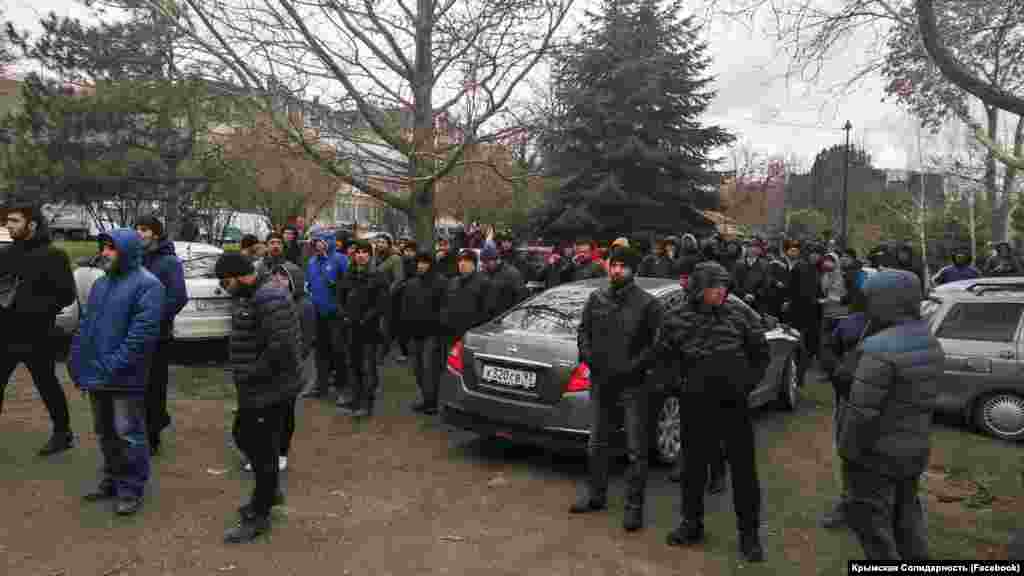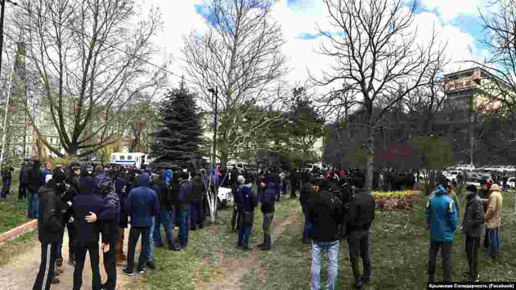 Aqmescitte Rusiye kontrolindeki Kiyev rayon mahkemesiniñ binası ögünde tutulğan qırımtatar faallerine qoltutmağa kelgen insanlar toplaştı. Bu aqta «Qırım birdemligi» cemaat birleşmesi bildire.