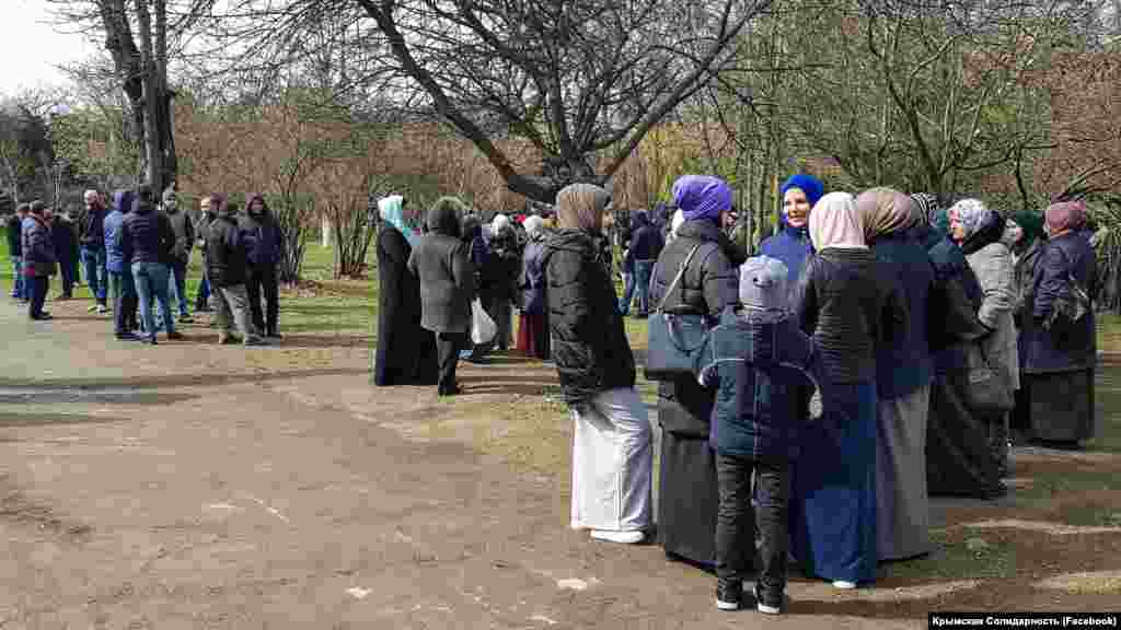 Qırımlılarnıñ balaları ve ömür arqadaşları qollarında «Bizler – Qırım birdemligimiz» ve «166 balağa babasını qaytarıñız» yazuvlı şiarlarını tuttı.