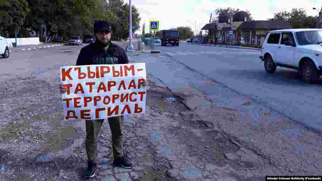 Qırımda rusiyeli silâlı hızmetlerge qarşı bir kişilik piketler keçirildi (foto galereyası)