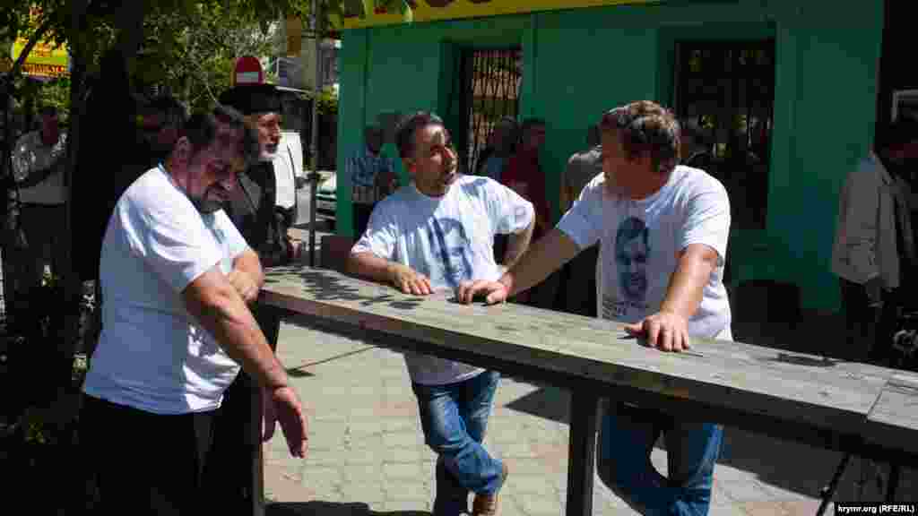 Aqrabalar, dostlar, aq-uquq qorçalayıcıları, cemiyet faaliyetçileri ve pervasız insanlar «fevral 26 işi» boyunca oturışuvlar keçken Rusiyeniñ kontroli altında olğan Aqmescitteki Merkeziy rayon mahkemesi yanına kelmege devam eteler. Bütün bu vaqıt içinde qırımtatar faaliyetçileri muhakeme etilgenlerge tışarıdan qol tuta, çünki olarnı içerige yibermeyler.
