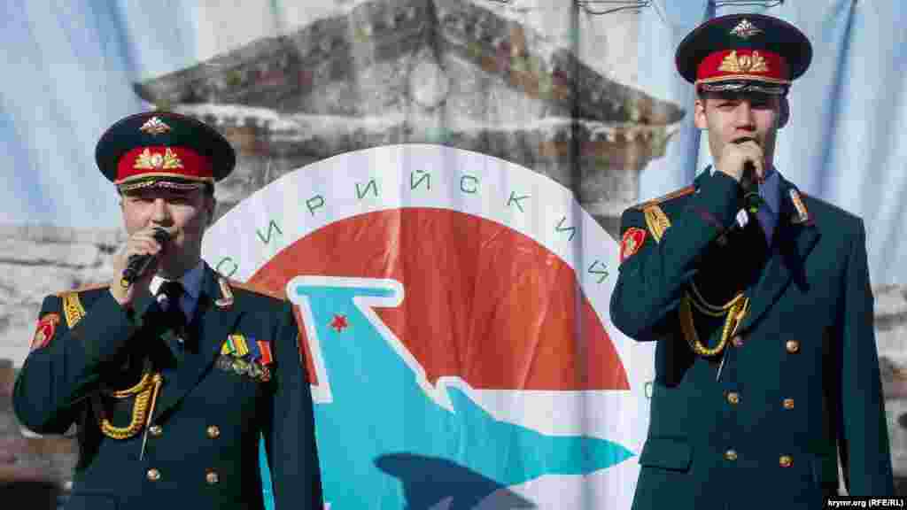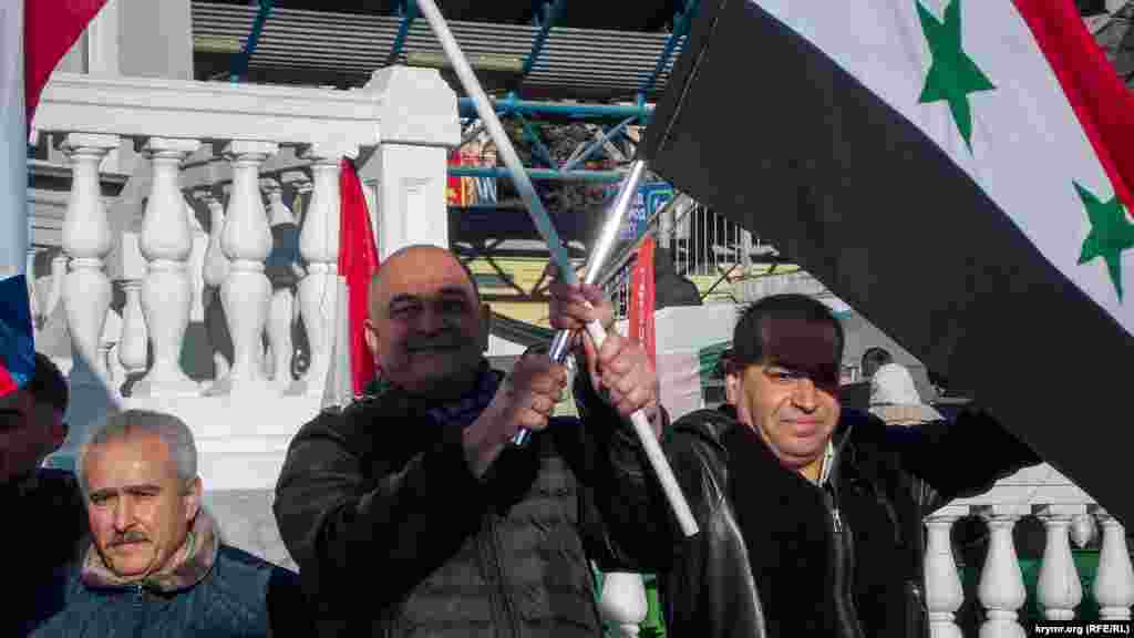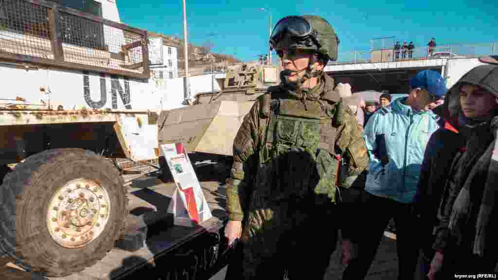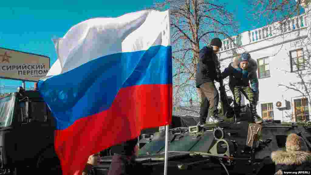Qırım.Aqiqat mühbiriniñ haber etkenine köre, köçme sergi ile Aqyarğa Suriye akimiyetiniñ vekilleri de keldi. Yigirmige qadar suriyeli zırhlı taşıtlarğa minip, “Ura!” qıçıruvlarınen Suriye ve Rusiye bayraqlarını salladı.